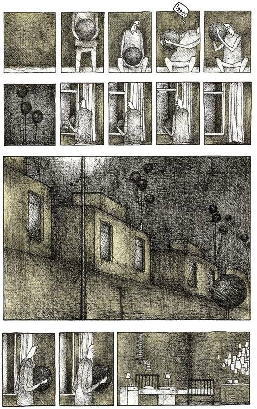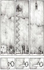 مصطفي يوسف معماري مصري درس فن القصص المصورة بجامعة لوفين للفنون في بلجيكا، حباً في السرد قام بإستخدام القصص المصورة كوسيط للتعبير عن الحيز المعماري و بالأخص تأثيره علي المجتمع، يظهر ذلك في أشكال المباني و تفاصيلها..ليس هناك ألوان و بالونات الأحلام لونها أسود، الرسومات بسيطة هادئة عندما رأيتها تذكرت أسلوب ورسم الفنان “جاسون” مؤلف “أنا قتلت هتلر” ولكن هنا أقل غرابة!